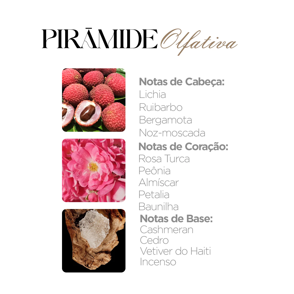 Este perfume exala uma aura de requinte e sofisticação desde suas notas de topo, onde a doçura da lichia se une ao toque picante do ruibarbo e da bergamota, acrescentando um toque de calor com a presença da noz-moscada.