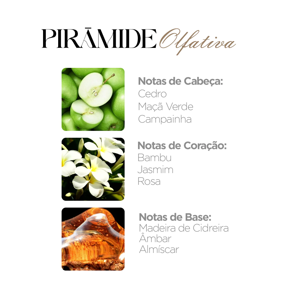 Notas de coração: Bambu, jasmim, rosa