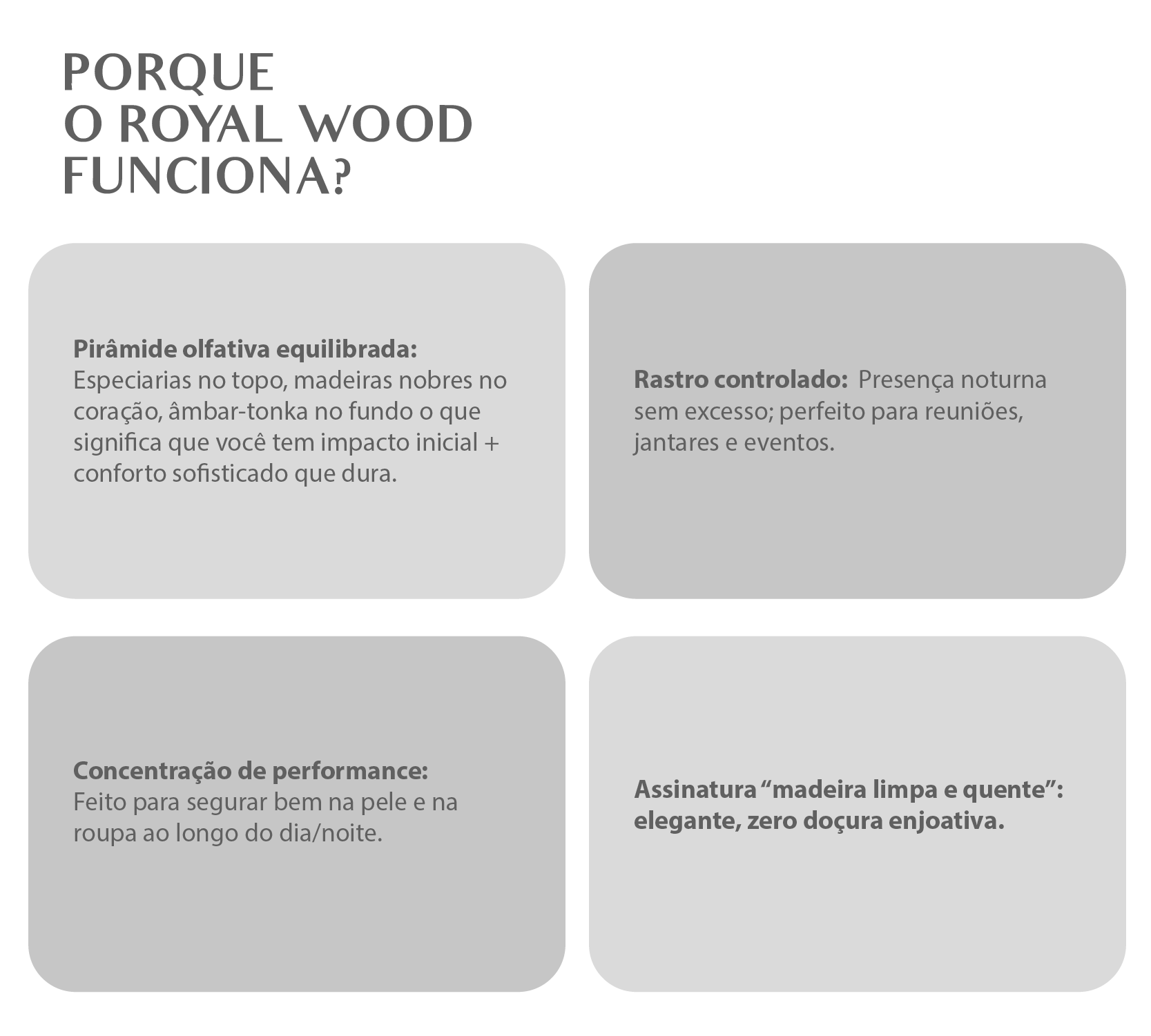 Inspirado na aura luxuosa dos grandes amadeirados de nicho, o Royal Wood foi construído para entregar projeção elegante e fixação prolongada em clima brasileiro o tipo de fragrância que faz as pessoas perguntarem: